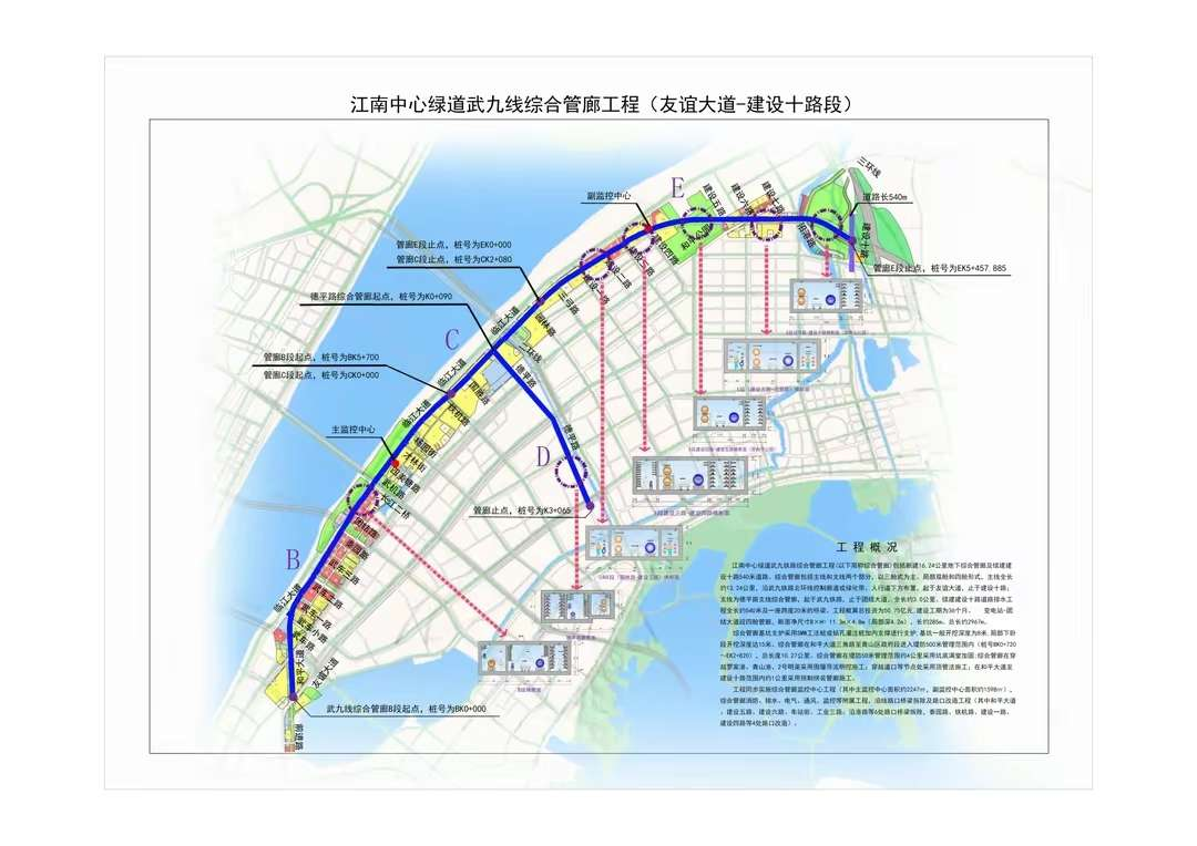 作為省市兩級(jí)重點(diǎn)工程,武九綜合管廊全長(zhǎng)約16.2公里,是武漢市城市地下綜合管廊專項(xiàng)規(guī)劃確定的重要干線管廊,創(chuàng)下多個(gè)“國(guó)內(nèi)之最”。它是國(guó)內(nèi)城市核心即老城區(qū)單次建設(shè)規(guī)模最大(長(zhǎng)度、斷面)的綜合管廊,是服務(wù)城市核心功能區(qū)(武昌濱江商務(wù)區(qū)、青山濱江商務(wù)區(qū)、華中金融城)數(shù)量最多的綜合管廊。