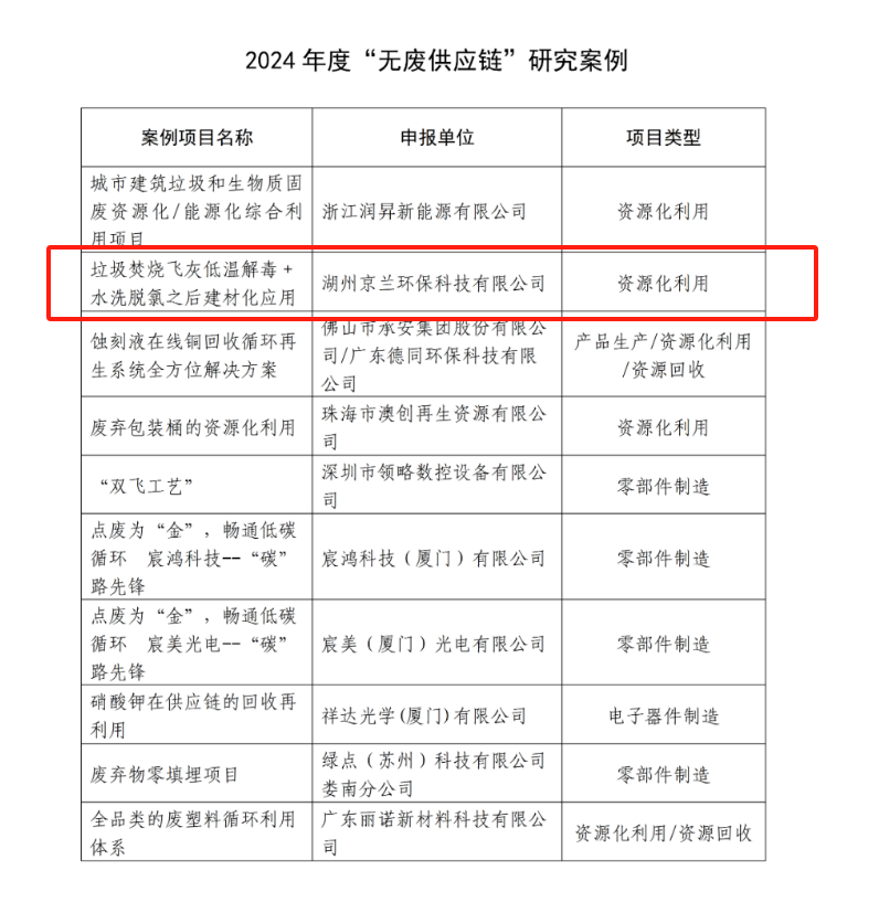 根據(jù)案例研究及匯報情況,本年度評選出10項“無廢供應鏈”評價試點及10項“無廢供應鏈”研究案例。湖州京蘭環(huán)??萍加邢薰緫{借 “垃圾焚燒飛灰低溫解毒 + 水洗脫氯之后建材化應用” 項目脫穎而出,成功入選 “無廢供應鏈” 研究案例。